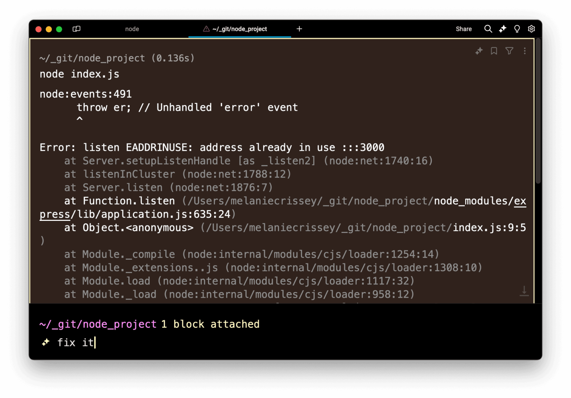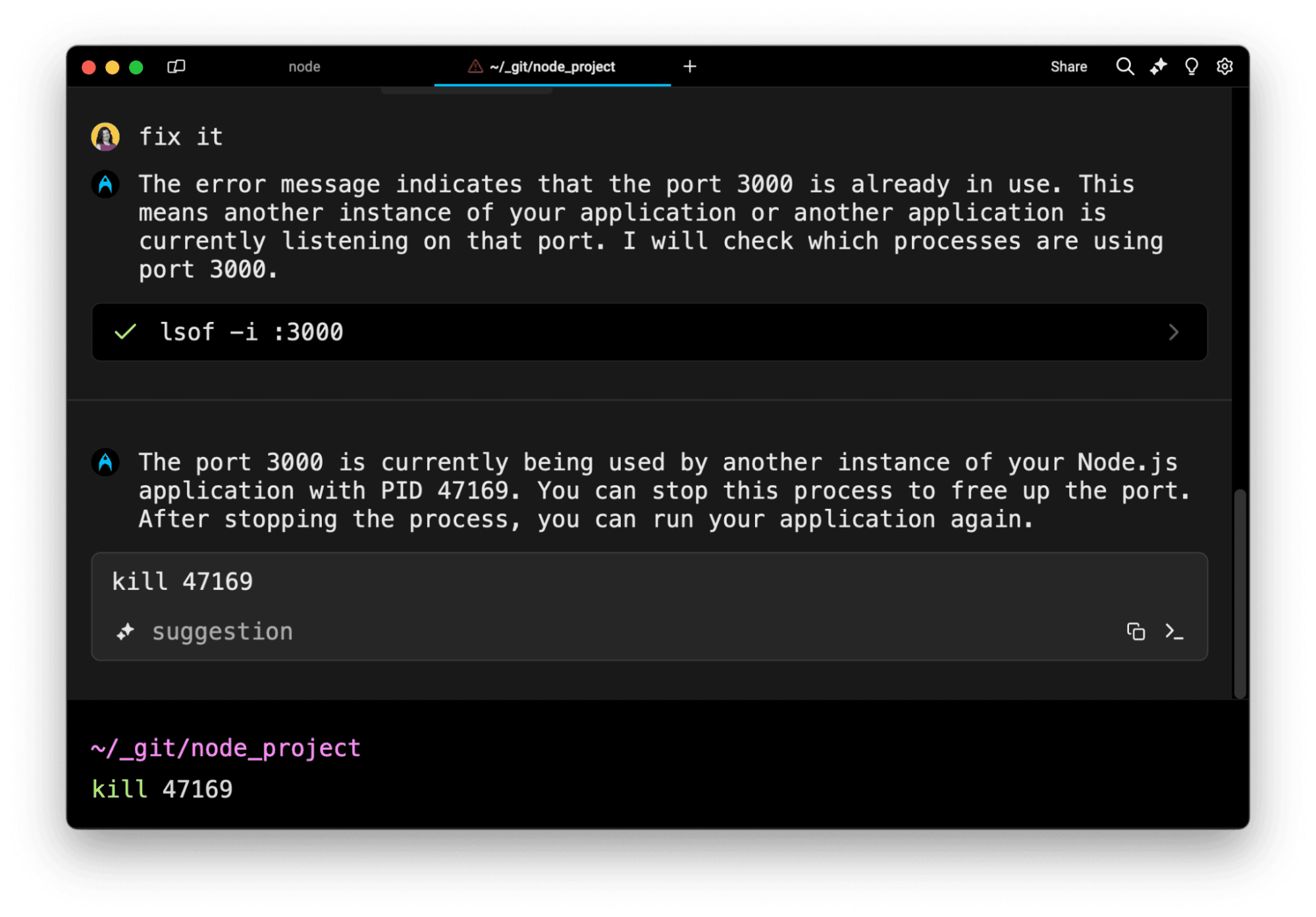 Let’s start with the simplest example: Say you’ve run into the super-common “port 3000 already taken” error. You can type “fix it,” attach the error context, and Agent Mode will respond to help.