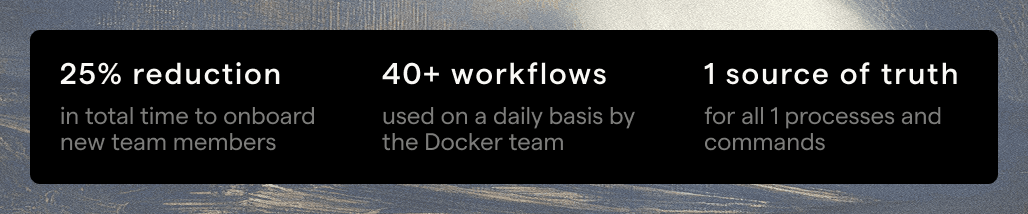 Adopting Warp led to fast, meaningful improvements for Docker’s implementation team. Onboarding time dropped by a full week (a 25% reduction) thanks to clearer, more accessible workflows. Team efficiency also improved across the board—people were able to stay in flow and updates to processes were instantly shared with everyone.
