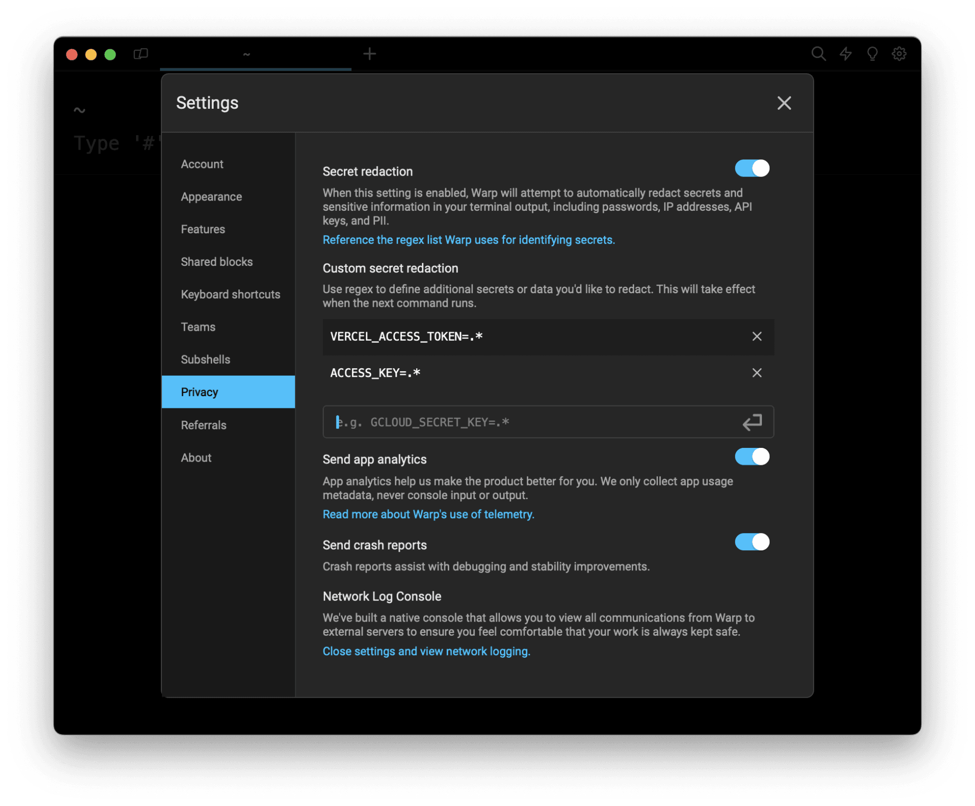 Warp’s default list of regex for secrets includes IP Addresses and common tokens, but you can also define your own custom regex expressions to hide secrets that aren't on the default list.