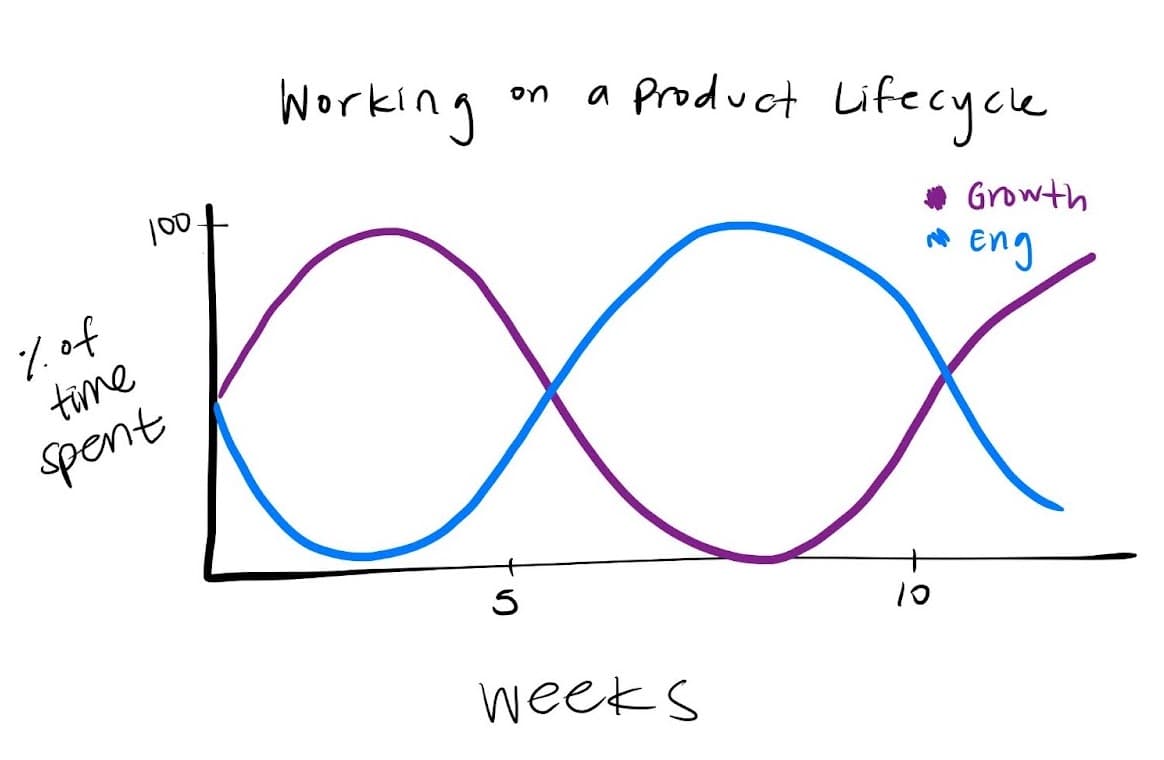 How to visualize working on growth and engineering across a product lifecycle. In my case, I spent the first five weeks focusing on user research (growth), then the next few building the product (engineering), and then testing the product and conducting more user research (growth), which then would theoretically become a continuous cycle.