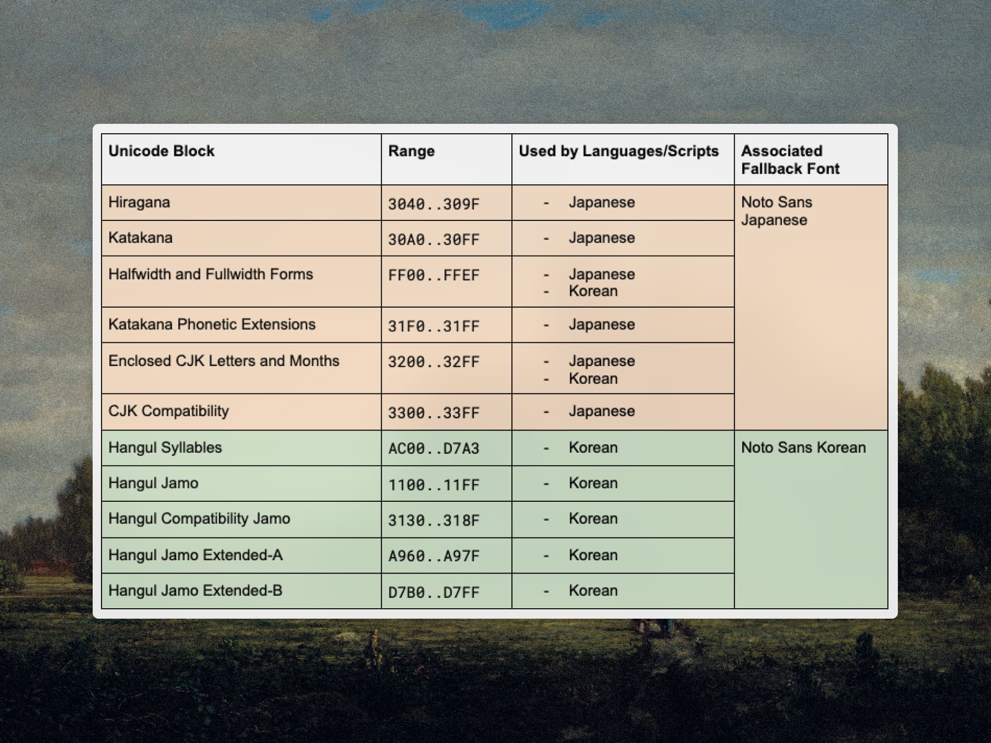 Unicode itself partitions the range of Unicode points into blocks. Each block represents a contiguous range of characters that generally are used to support a single language or symbol type. This was a useful starting point for determining which Unicode ranges we wanted to map to which fallback fonts.