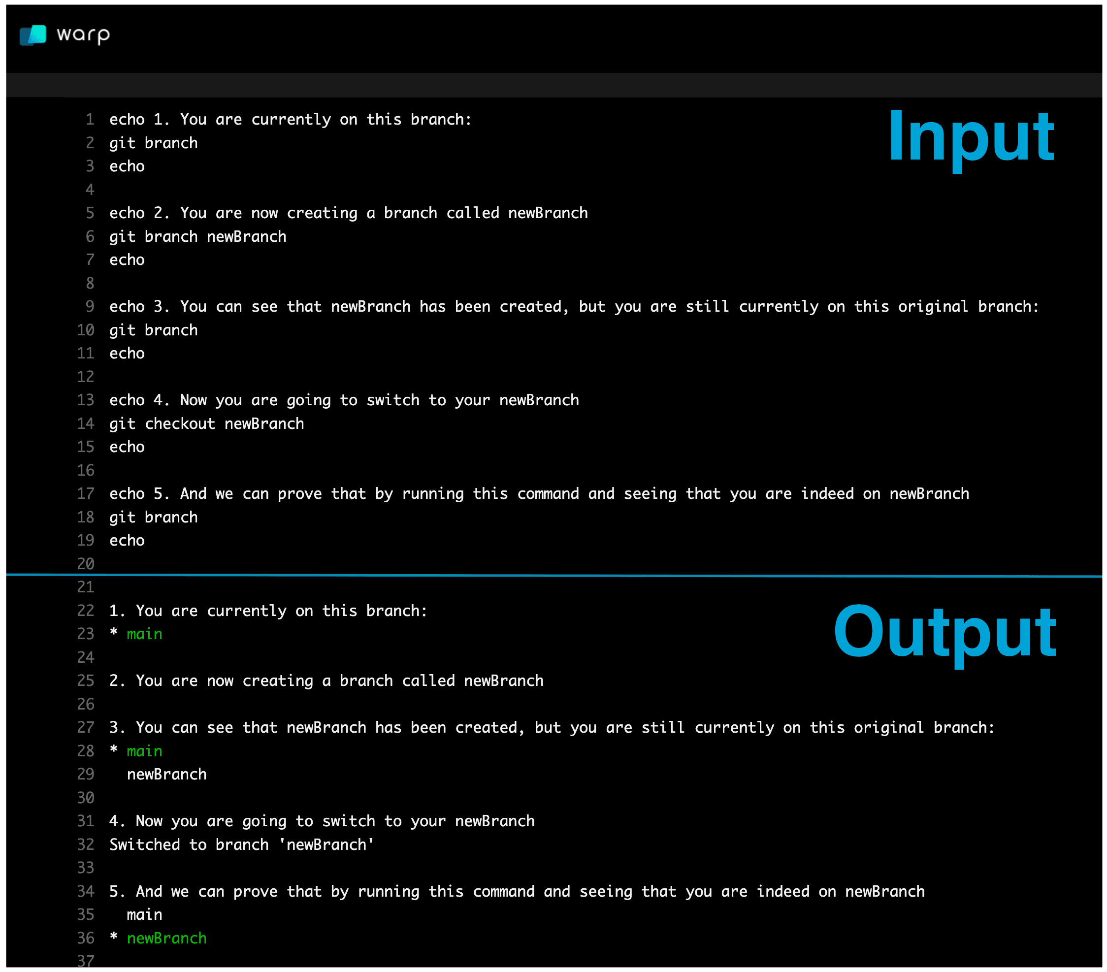 Git checkout -b is a command that will create a new branch and switch you into that new branch from your current branch. I went ahead and ran the command in my local environment to show you what you should be seeing as your output. Here is what the output looks like.