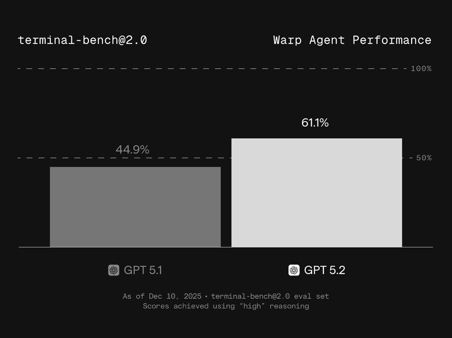 Paired with Warp, GPT-5.2 achieved a best-in-class score of 61.14% on Terminal Bench, marking Warp’s strongest performance to date.