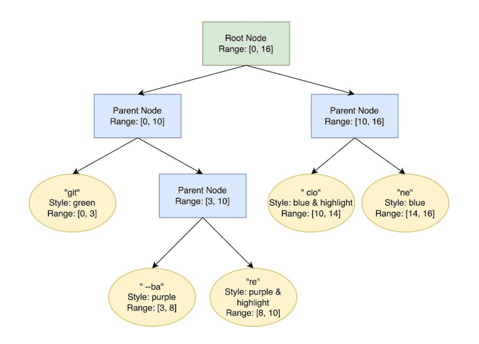 Let’s take a look at what the "git --bare clone" example would look like within SumTrees (note that we’re glossing over some of the complexity of the data structure for illustrative purposes e.g. keeping track of when text is inserted/deleted). Specifically, let’s try representing the last 3 lines from the example above in a SumTree. First, we start off with 2 child nodes representing parts of different styles: