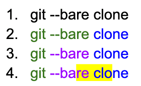 - We have 3 parts: green, purple and blue contiguous text (“git”, “ --bare” and “ clone”).