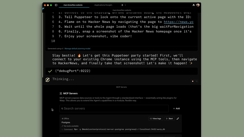 Using the Puppeteer MCP server to take a screenshot of a webpage from Warp