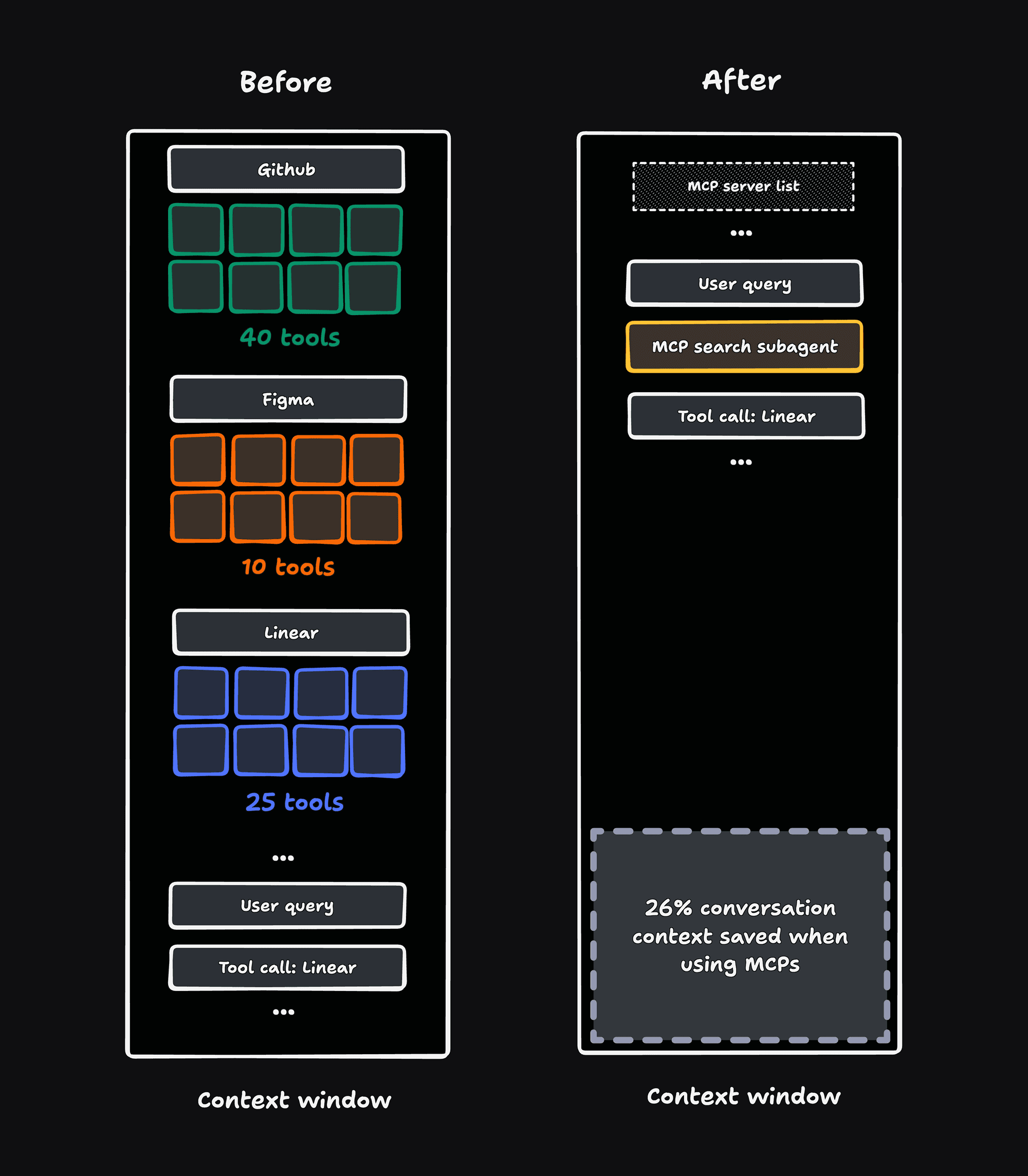 Users who reach for MCP quickly become power users, plugging in multiple servers for various workloads. In our previous implementation, this high usage had a detrimental impact on conversation quality and efficiency. We would preload all MCP tools and resources into the context window, which could bloat the context window by as many as 50k tokens from these definitions alone. This cost compounds over longer conversations and ultimately distracts the agent from the core task.