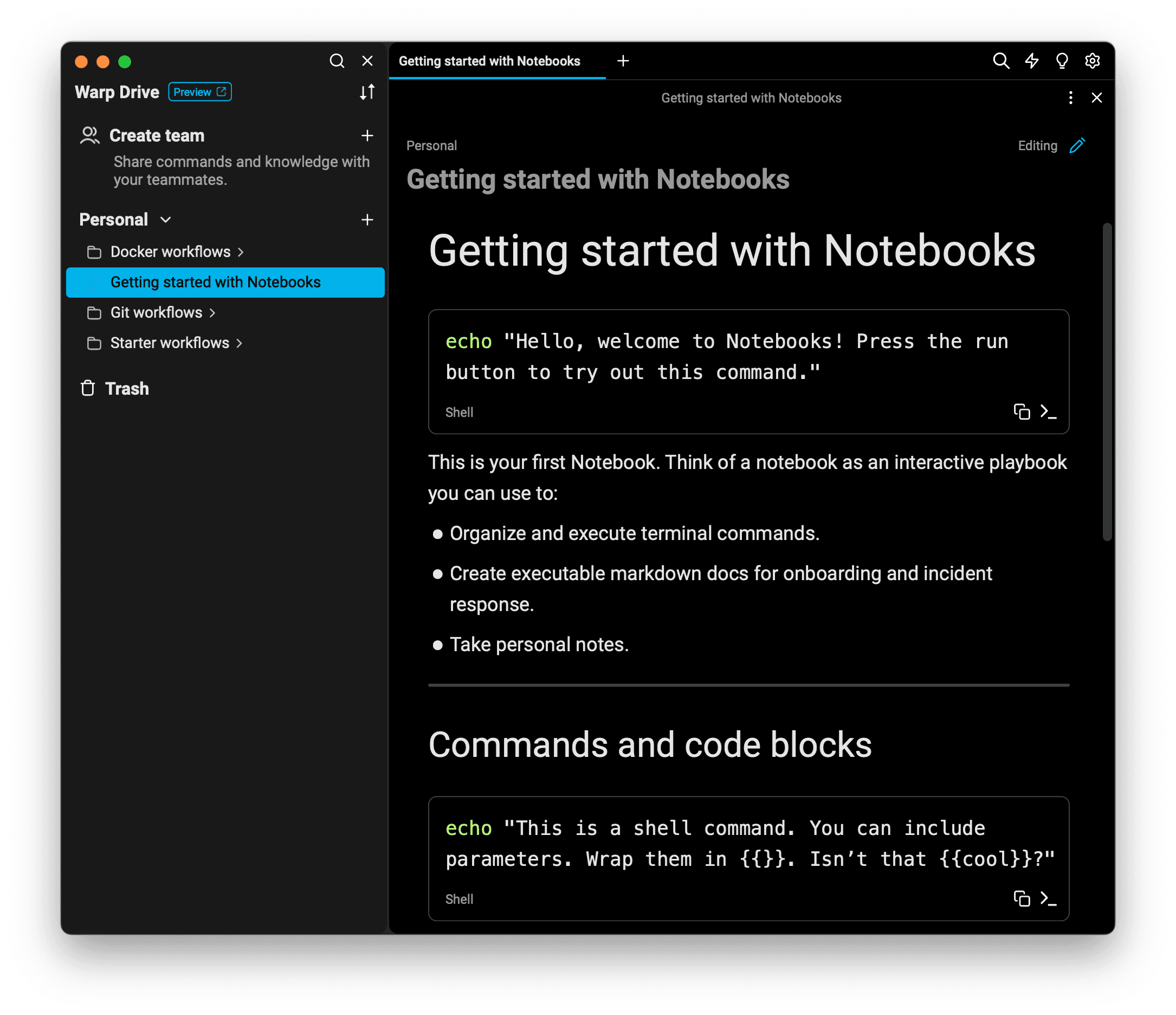 With new Notebooks in Warp Drive, your terminal-specific documentation stays in your terminal.