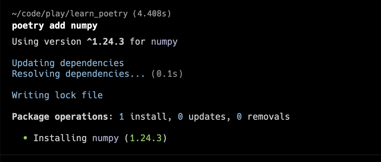 To add a dependency, use the poetry add command. There’s a counterpart, poetry remove. You can specify package versions with @^, @~, =, ==. If you don’t specify a version, Poetry installs the latest version.