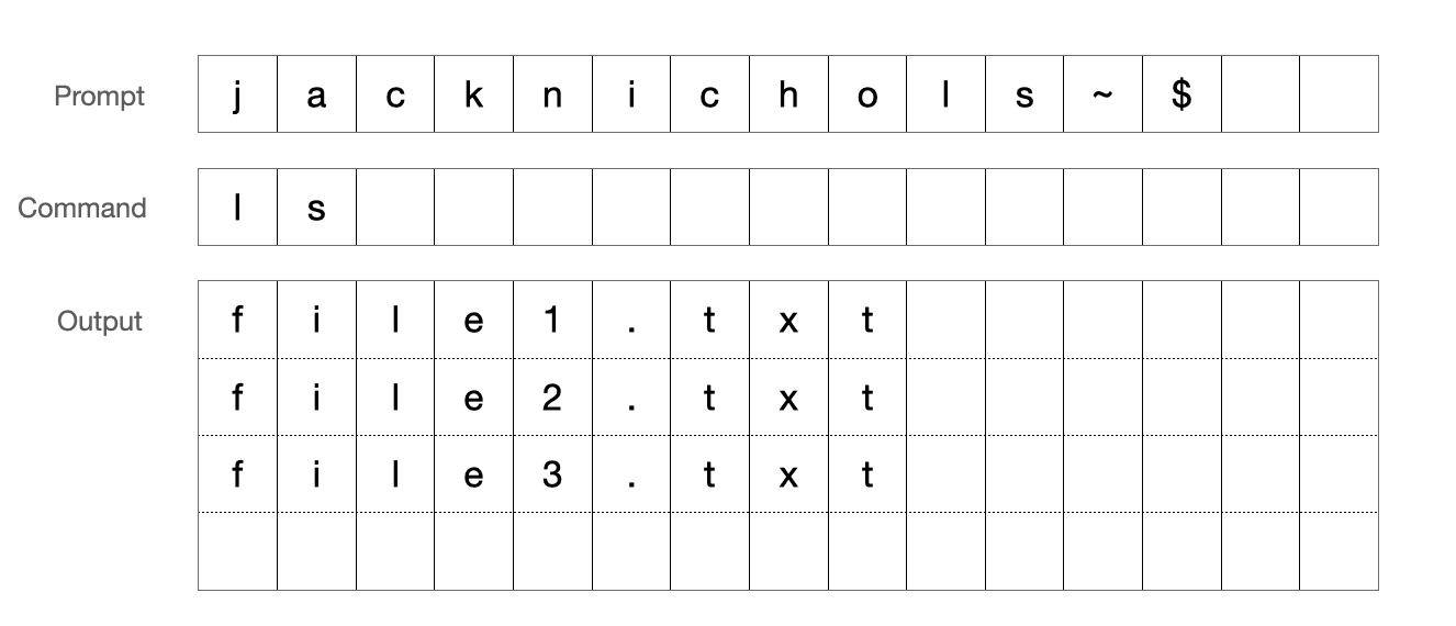If a terminal session is really some conversation history between the terminal and the commands it has executed or is currently executing, then it’s the grid that provides some agreed-upon format or ledger to converse. It’s not just that grids are a convenient choice for terminal builders; the grid is actually what’s required by the program the terminal is layered over, the shell. The shell moves a cursor and outputs characters within a defined two-dimensional space, and the terminal is responsible for storing and rendering the contents of that space to the end-user. This makes the concept of the grid a – if not the – fundamental engineering specification of terminals.