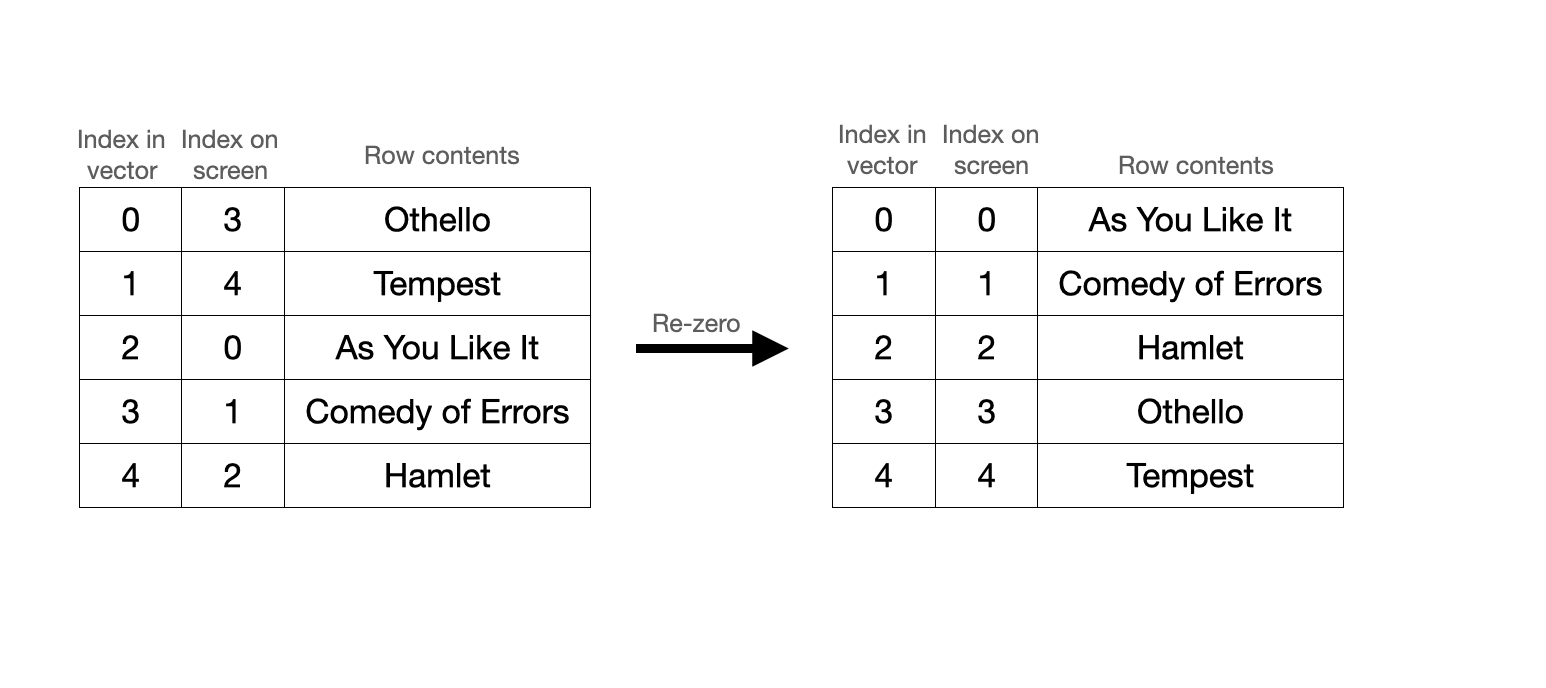 Nevertheless, the whole process of index conversions presupposes that the grid needs to be rotated in the first place. Why is that the case? Why not skip the silly conversions and enforce equivalence between the screen indices and the vector indices, meaning that “As You Like It,” the first row on screen, is also stored as the first row in the vector? Not surprisingly, this is because the grid is heavily optimizing for something else entirely: scrolling!