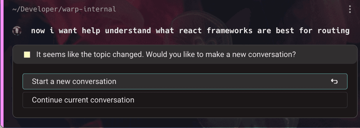 Warp includes a feature which will attempt to detect when a conversation has switched subjects sufficiently such that it’s best to start a new conversation, instead of continuing the previous one. However, you know best as to when the previous conversation is no longer relevant to your current ask!