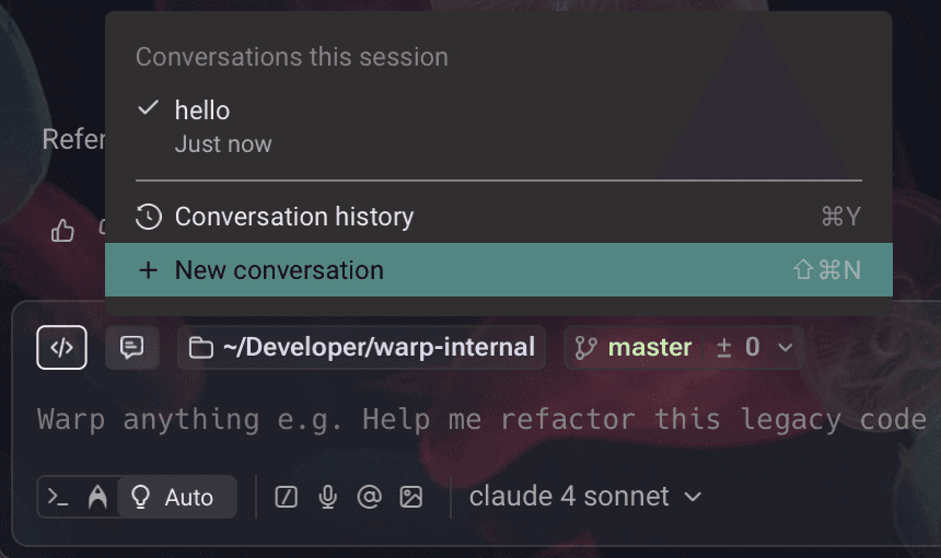 Let’s say you just asked Warp to build a new feature in your React app for you. It completes the task and summarizes what it did. When you go to deploy it, you realize that your gcloud binary is corrupted, and you want help fixing that too. If you follow up on the summary from the React conversation, not only might you confuse the agent by talking about a totally different task than the one it built up a lot of context trying to understand, but by continuing an irrelevant conversation, you’ll use a lot more credits, too! Instead, use the conversation selector in the input to start a new conversation, or open up a new pane or tab.