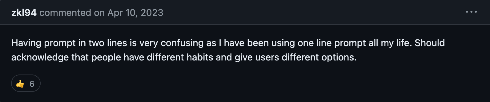 The most common reason for requesting the Same Line Prompt was to have a familiar experience. Some developers shared that the new line prompt was too confusing and it caused them to switch back to iTerm2.
