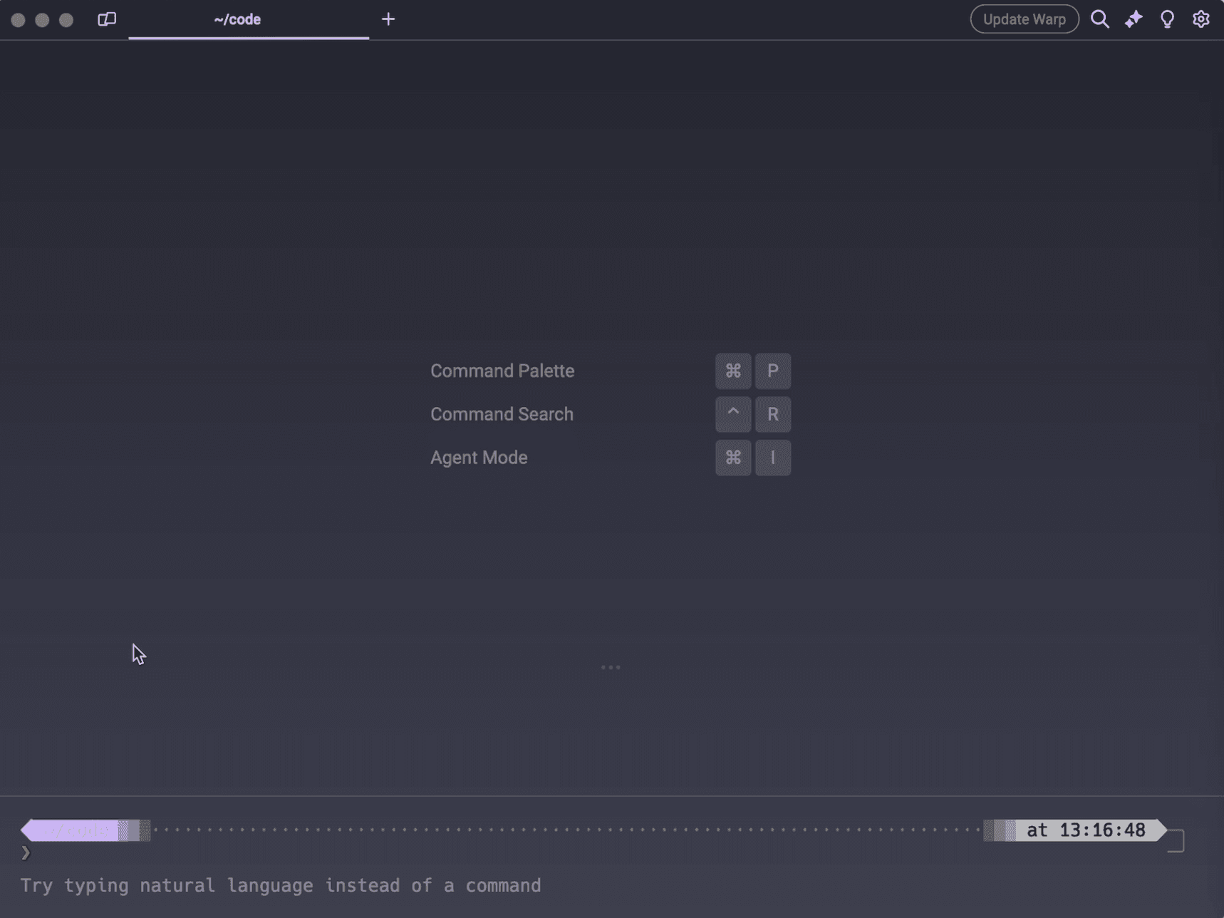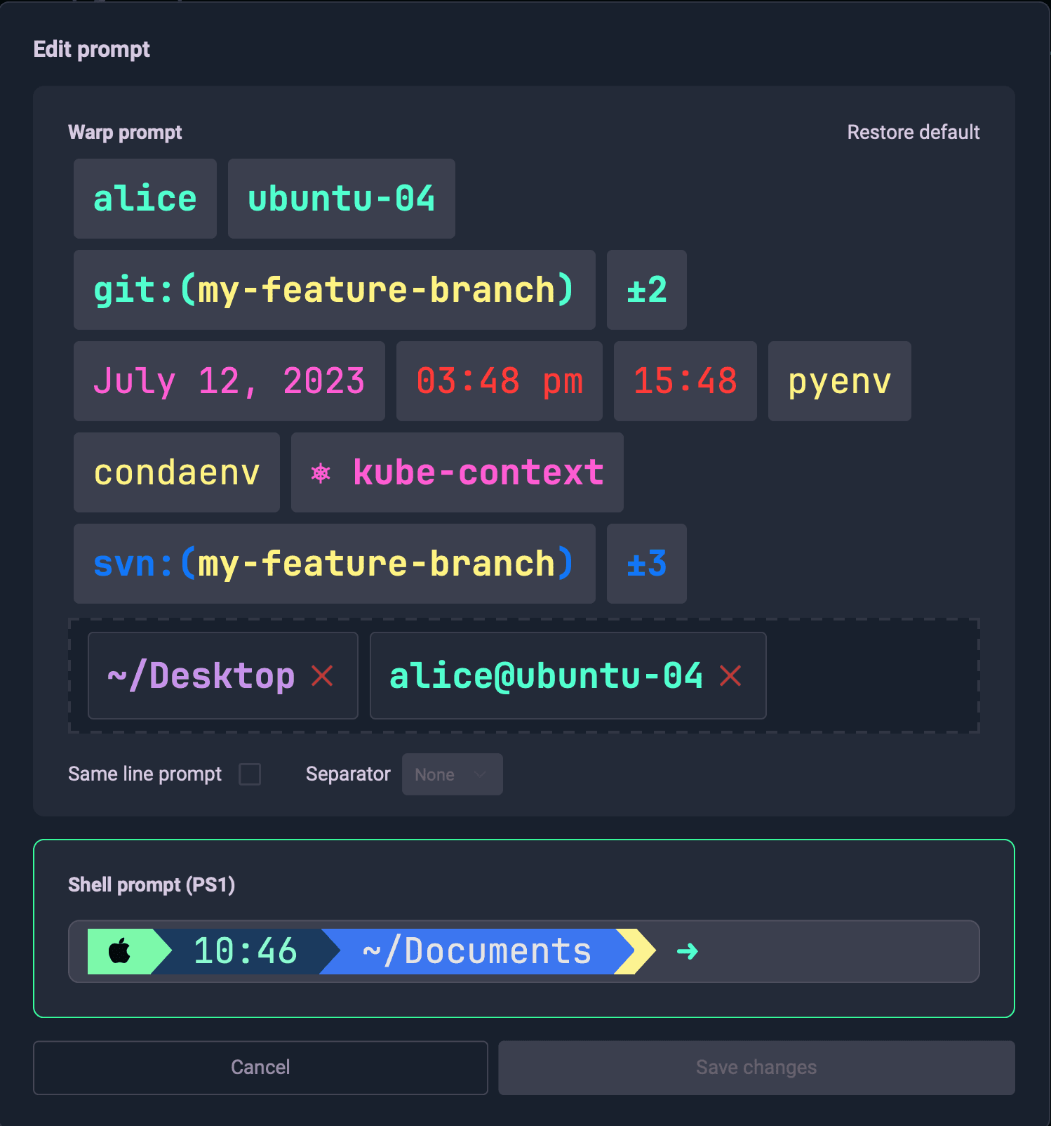 In Warp, you can choose to use Warp’s prompt, which can be customized, or you can use your shell prompt (PS1). Many developers choose to stick with PS1 so they can use custom prompt themes like Starship or Powerlevel10k.