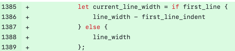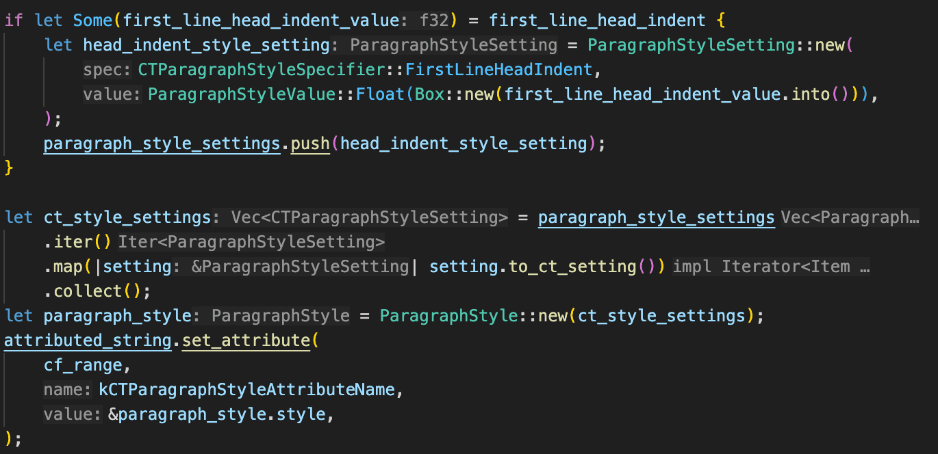 On the Linux side, we added the functionality of indentation to COSMIC Text, which is an open source library. We hope to merge the changes from our fork upstream soon! A small snippet of the core changes are included below: