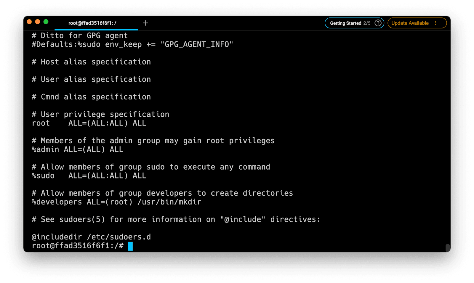 Because of the sensitive nature of its content, it is highly recommended to only open it using the visudo utility — which uses the vim text editor under the hood — as it will automatically check for syntax errors before the file is saved, preventing us from ending up with a broken system where it is impossible to obtain elevated privileges.
