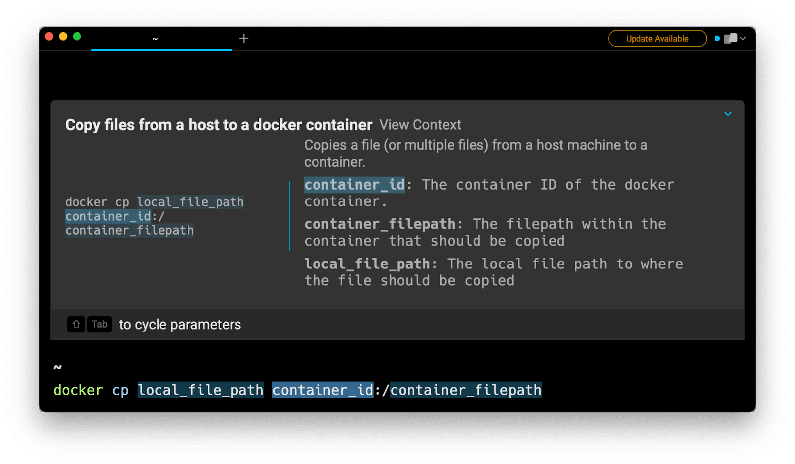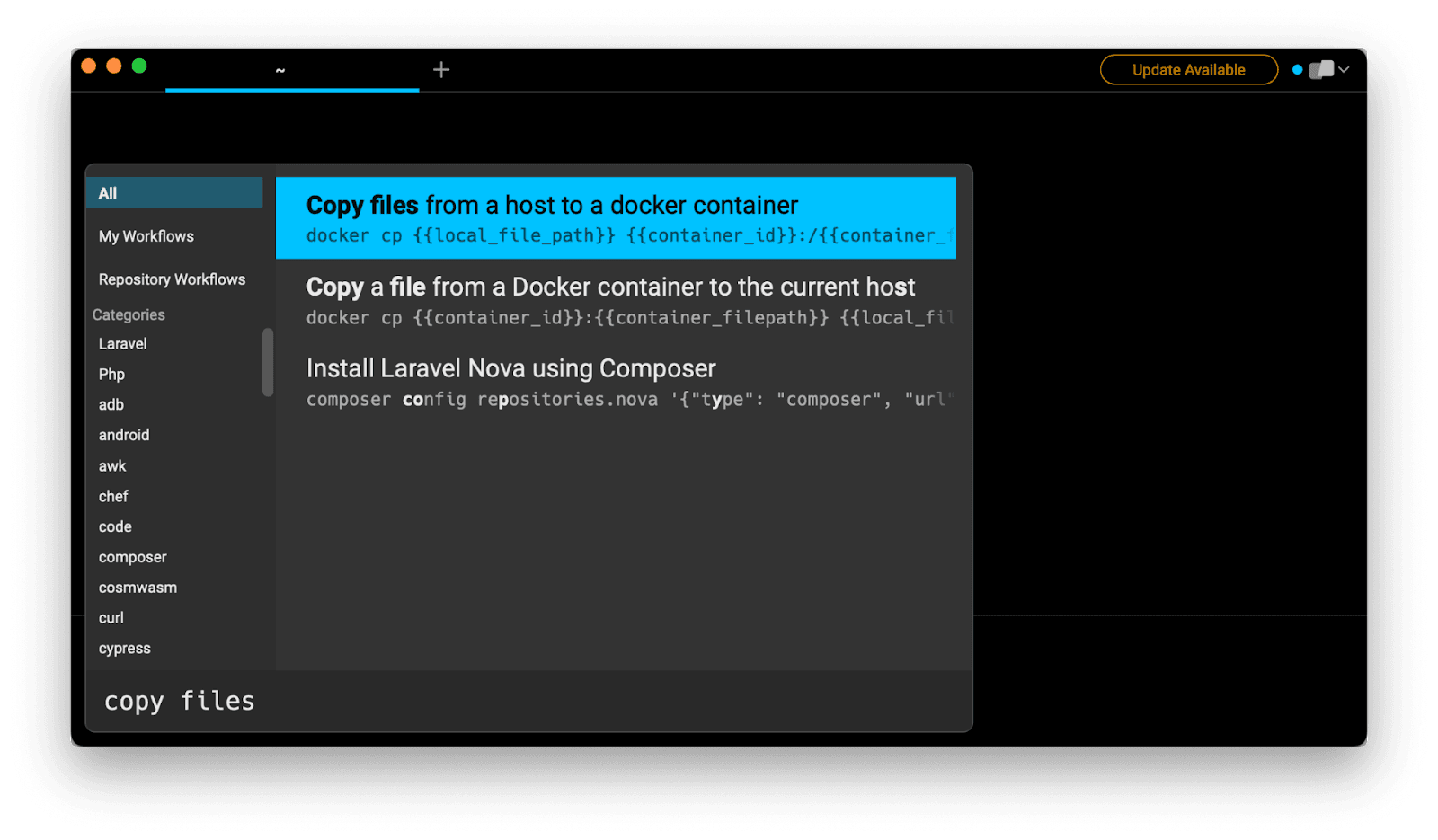 If you’re using Warp as your terminal and you need to quickly retrieve this command, you can use Warp's Workflows feature by pressing CTRL-SHIFT-R and typing copy files: