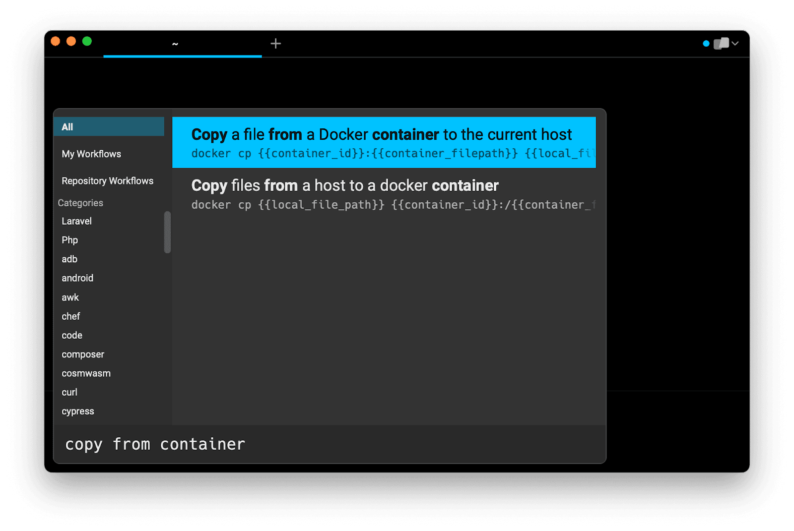 If you’re using Warp as your terminal and you need to quickly retrieve this command, you can use Warp's Workflows feature by pressing CTRL-SHIFT-R and typing copy from container: