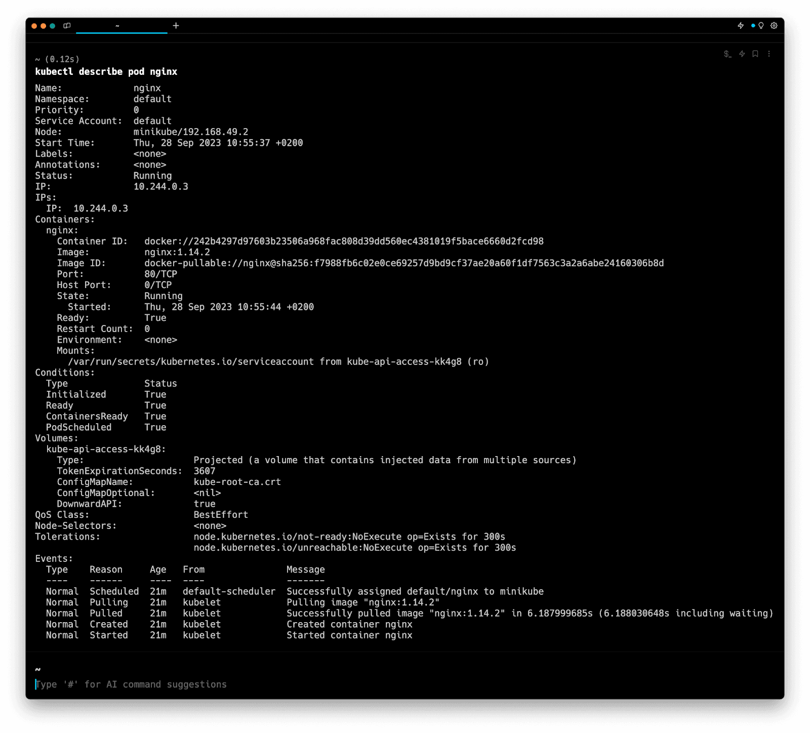 This command will display all the details of your Pod, such as its status, the status of containers running within it, IP address, associated namespace, ports, events, and more (similar to the kubectl describe pod command).