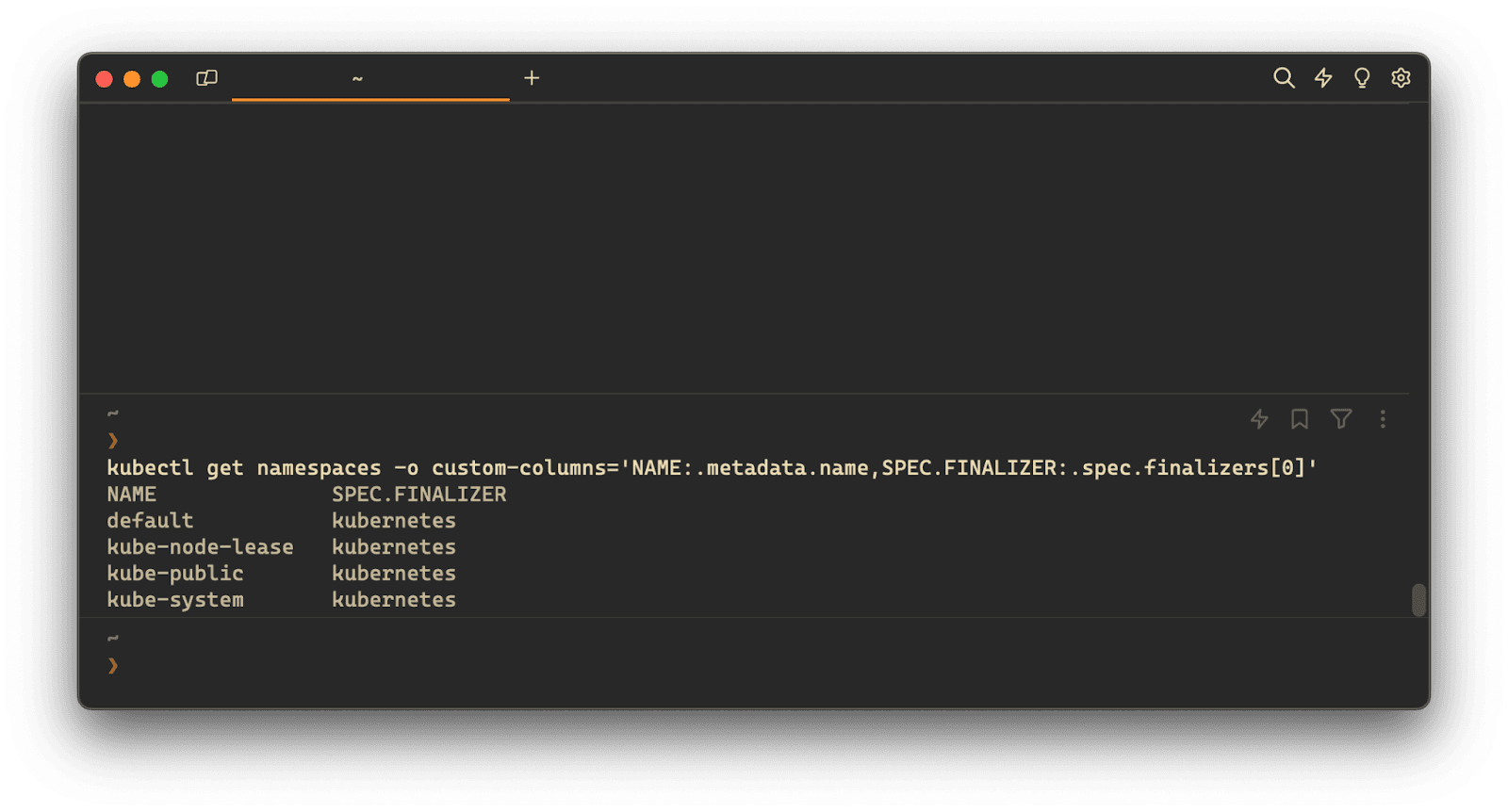Upon execution, the above command will output two columns, NAME populated with the values of metadata.name and SPEC.FINALIZER populated with the first values of the spec.finalizers .