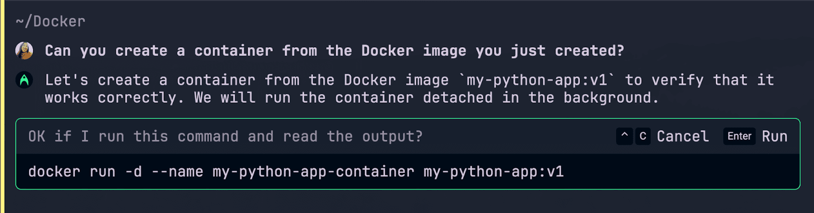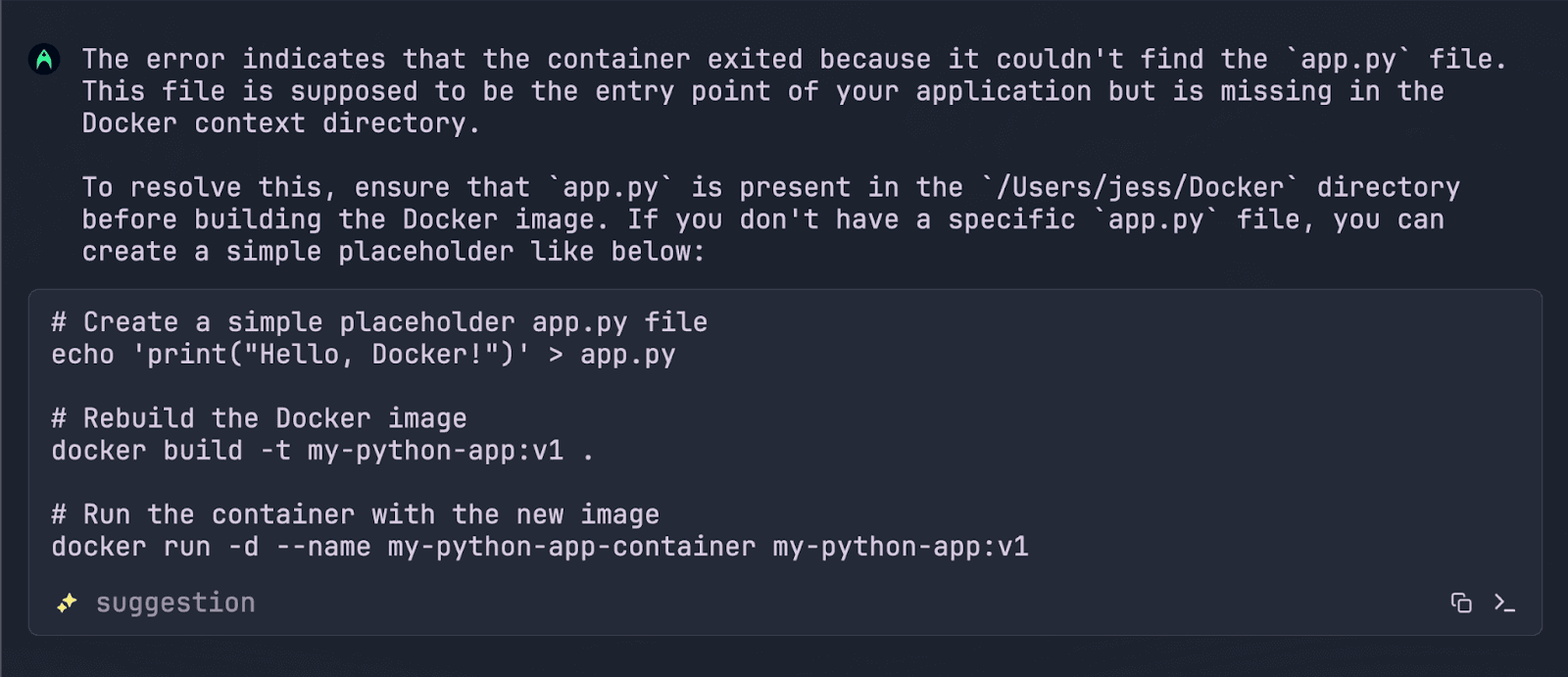 Another thing I like about using Warp’s Agent Mode is that it can easily help me debug and fix errors without much context switching. When I tried to run this command at first, I ran into an error because my Docker image was trying to run the command python3 app.py but app.py did not exist:
