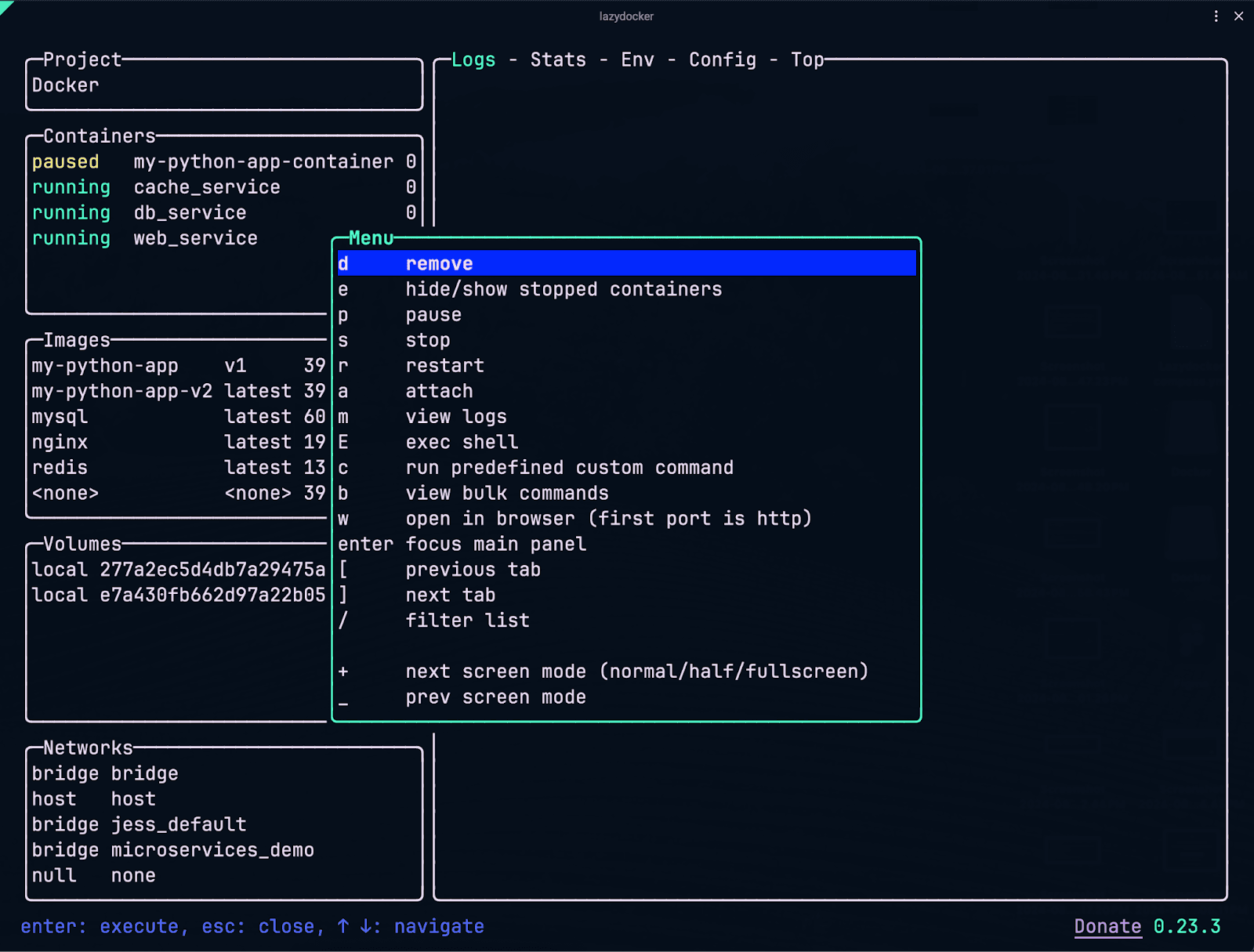 5. The last thing you can do with containers is manage them. LazyDocker makes this really easy. Press “x” to see the menu, and do things like “pause” or “remove” a container.