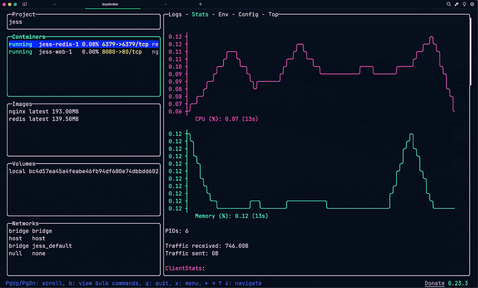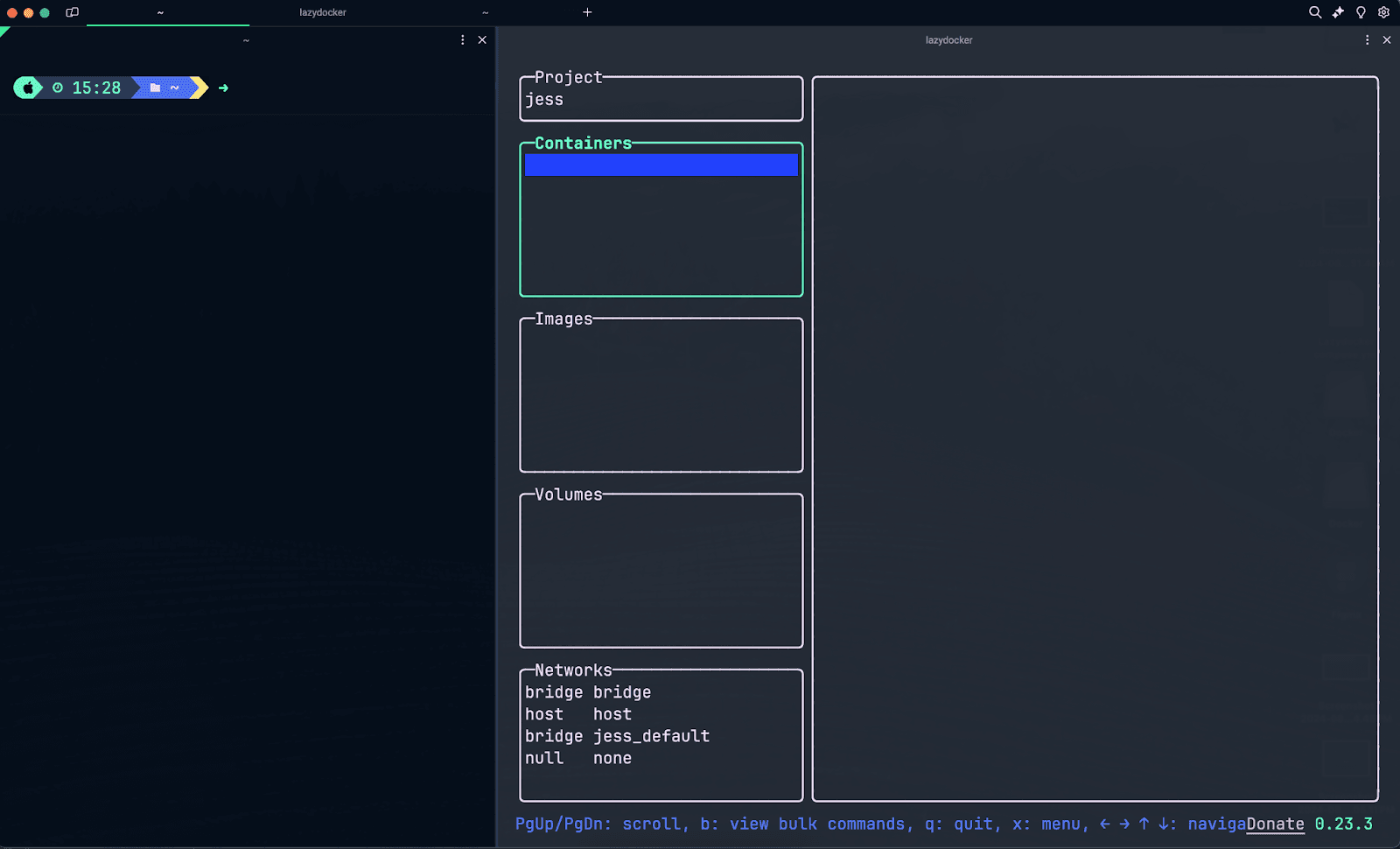 Which will open up the LazyDocker TUI in that pane. Your setup should look something like this: