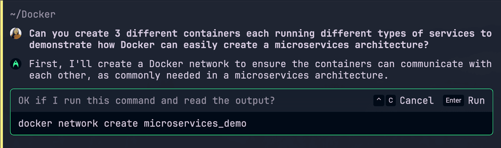 Which creates a new user-defined network in Docker named “microservices_demo” and allows multiple Docker containers to communicate with each other. Then, it asks to create three different Docker containers running different types of services: