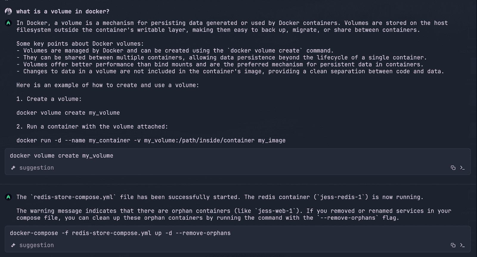 - Manage: You can start, stop, and manage containers. For example, docker ps lists running containers, and docker stop stops a running container.