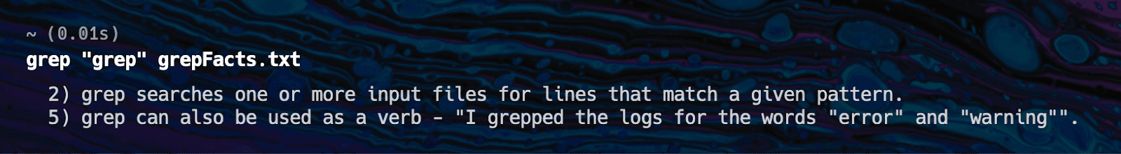 - [Feel Free To Skip This Step] If you’re curious or want to verify that this command is actually saved in your file, run cat grepFacts.txt. This command will output all the contents of the file grepFacts.txt.